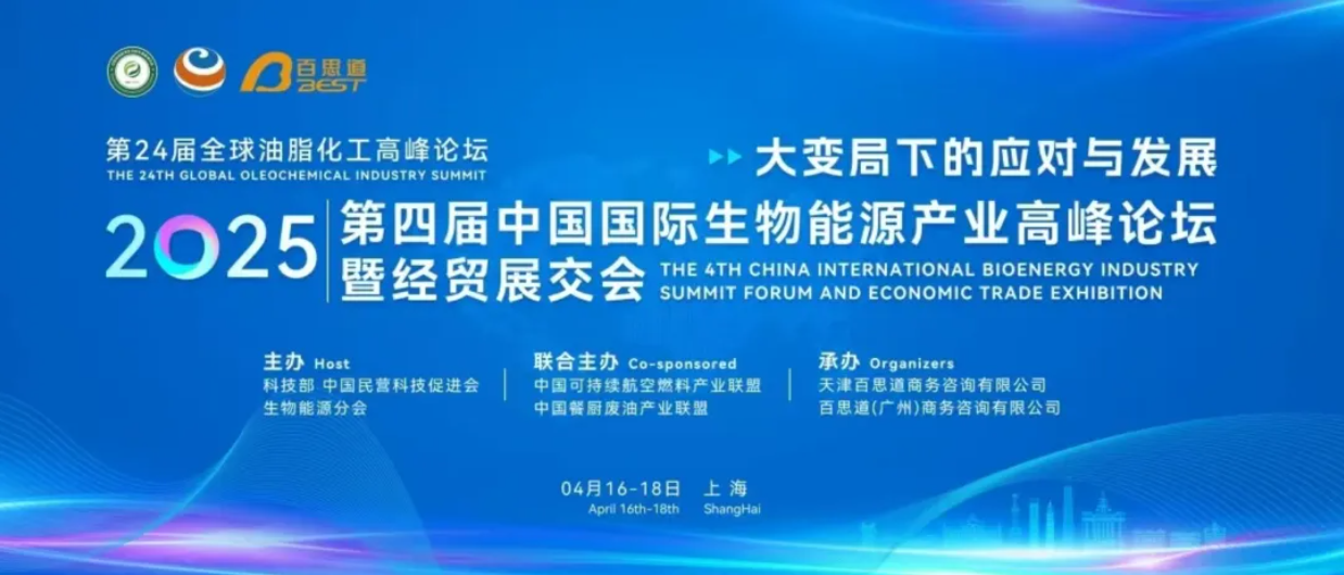第四届中国国际生物能源产业高峰论坛暨经贸展交会,由科技部中国民营科技促进会生物能源分会主办,中国可持续航空燃料产业联盟和中国餐厨废油产业联盟联合主办,于2025年4月16-18日在上海建工浦江皇冠假日隆重举行。