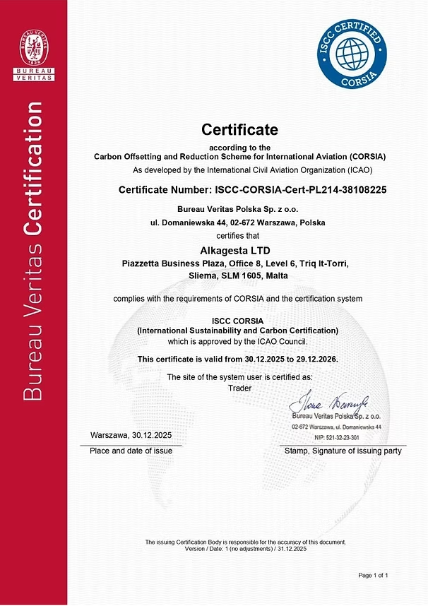 Alkagesta 将供应符合CORSIA标准的可持续航空燃料