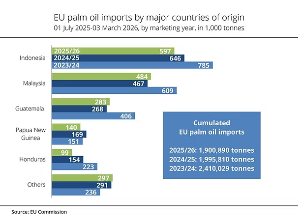 根据欧盟委员会最新数据,2025年7月1日至2026年3月3日期间,欧盟棕榈油进口总量为190万吨,较上一年同期的近200万吨继续下滑,延续了自2030年将棕榈油基生物燃料排除在温室气体配额之外政策公布以来的下降趋势。